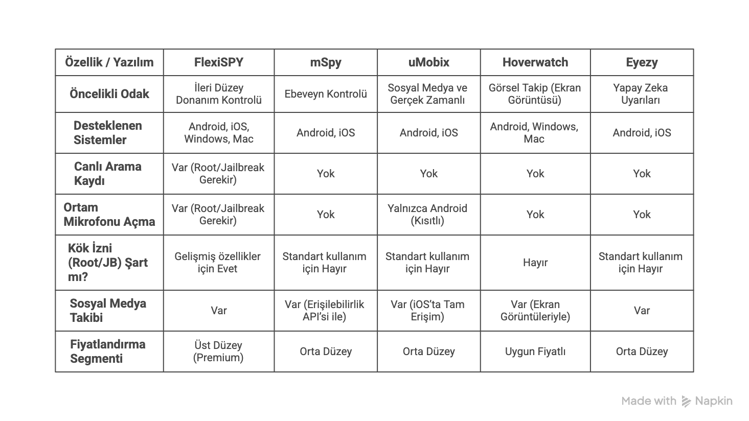 Aşağıda, karşılaştırma tablosunda yer alan yazılımların çalışma prensipleri, teknik yetenekleri ve kullanım sınırlandırmaları detaylı bir şekilde ele alınmıştır. İlk sırada, gelişmiş özellikleri nedeniyle sıklıkla tercih edilen FlexiSPY uygulamasına yer verilmiştir.
